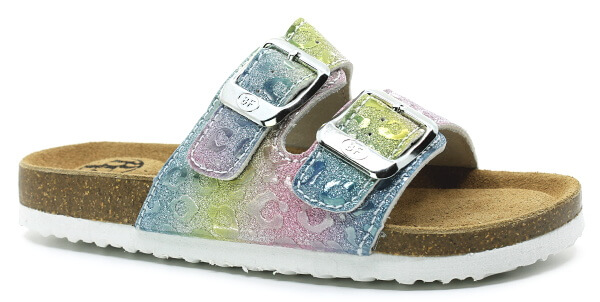 BEST FEET 525-11 duhové, dětské pantofle  Dívčí přezůvkové pantofle vyrobené ze syntetické kůže v duhové barvě. Zapínání na dva nastavitelné nártní pásky, vybavené podšívkou z pravé kůže.   Pantofle mají anatomicky tvarované stélky s polštářkovou technologií SOFT  IMPACT CUSHION pro měkký nášlap, ... celý popis
