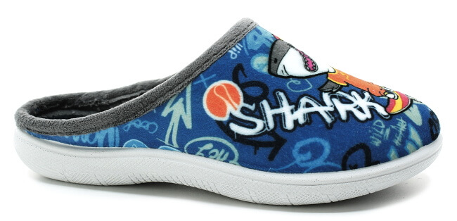 Dětské domácí pantofle v modré barvě s obrázkem žraloka.