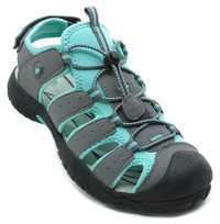 Dětské dívčí sandálky v uzavřeném střihu v šedé a tyrkysové barvě.