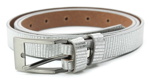 Dámský kožený opasek ve stříbrné barvě o šířce 20 milimetrů.