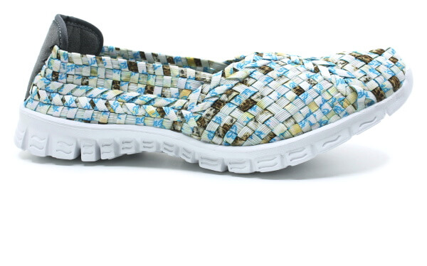 - Pružný svršek: Ručně proplétané textilní gumičky v kombinaci bílé, modré a šedé barvy zajišťují špičkovou prodyšnost a elasticitu. Jsou ideální volbou pro citlivé nohy, nohy s haluxy nebo vyšším nártem.