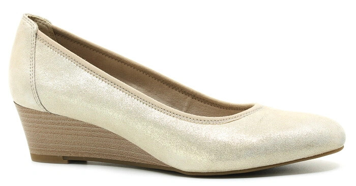 Oblíbený vzor dámských vycházkových lodiček na klínku v béžovozlaté barvě.